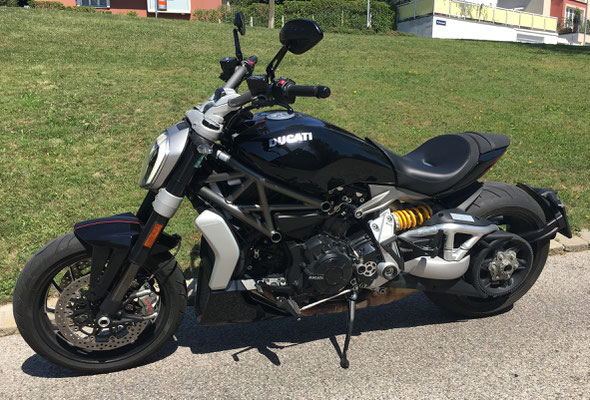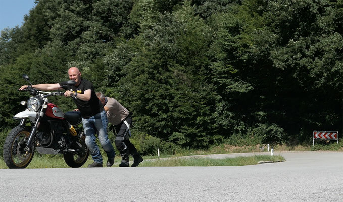Retro-Motorräder liegen weiter ganz im Zeitgeist, mit der Ducati Scrambler Desert Sled habe ich mich daher eine Woche lang auch mal im Mainstream bewegt – freilich vornehmlich abseits der befestigten Wege, also überall dort, wo ich mich sonst auch mit meinen Motorrädern herumtreibe. Die fesche Ducati, die nicht nur mich an die gute, alte Yamaha XT 500 erinnert, hat sich in meinen Augen als alltagstaugliches Gefährt bewiesen, wie im ausführlichen Testbericht nachzulesen ist. Inklusive eines kurzen, etwa zweiminütigen Trailers. Eigentlich war ja ein längeres Video geplant gewesen, am gemeinsam mit meinem Tigerkumpel Christian vereinbarten Drehtag hatte ich auch schon ein spannendes "Drehbuch" im Kopf, jedoch schon nach wenigen Kilometern einen platten Vorderreifen (aufgrund eines Produktionsfehlers im Schlauch, wie sich später herausstellte). In Ermangelung des nötigen Werkzeugs (dafür waren jede Menge Kameras und auch eine Drohne dabei) wurde bald klar, dass bei Schlauchreifen auch die ÖAMTC-Pannenhilfe kapituliert, hatten wir also genug Zeit für Benzingespräche im Schatten, bis Ducati-Cheftechniker Winni Peiritsch persönlich die Scrambler holte und mir zur Überbrückung (schon am nächsten Morgen war der Reifen geflickt bzw. Schlauch getauscht) eine XDiavel S zur Verfügung stellte. Die ist eher nix fürs Gelände…
