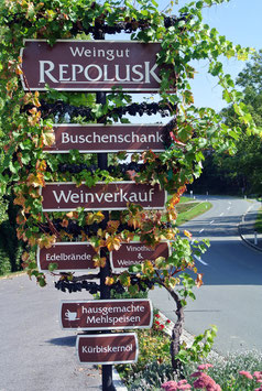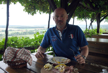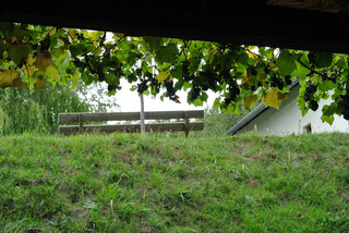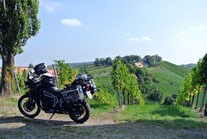 Um keine Missverständnisse aufkommen zu lassen: Der Fahrer hat selbst am köstlichen Sturm nur genippt, den Weinkauf - der ungenützte Platz der Seitenkoffer wurde mit Sauvigon Blanc und eben Schilcher-Sturm aufgefüllt - überließ er Sozia, deren Gaumen sein vollstes Vertrauen genießt. Die Fahrt, die uns teilweise über die selben Strecken führte, die wir am letzten Tag unserer Balkan-Reise im Juni gefahren sind, war kurven- und abwechslungsreich, fast hinter jeder Ecke bot ein Weingut die Produkte seiner Reben feil, hier könnte man Tage mit Wandern und Schlemmen verbringen, ohne Langeweile aufkommen zu lassen. Dazu fehlte uns freilich die Zeit, auch widerstanden wir trotz zunehmenden Hungers den verlockenden Angeboten sämtlicher Buschenschanken und Gasthöfen, so nett deren Gärten auch aussahen.