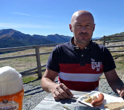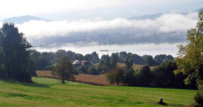 Auch am nächsten Morgen lachte die Sonne vom Himmel, wenngleich über den Kärntner Seen zunächst noch die für diese Jahreszeit üblichen Nebelschwaden hingen. Nicht so hoch oben auf der Soboth (1.347 m), über die eine breit ausgebaute Straße in die Steiermark führt und wo wir uns beim Bikertreff "Kärntnerblick" einen letzten Kaffee auf Kärntner Boden genehmigten. An Wochenenden trägt hier die örtliche Knieschleifer-Fraktion gerne ihre Rennen aus, weshalb da doppelt Vorsicht geboten ist, wir hatten den Pass fast für uns allein.