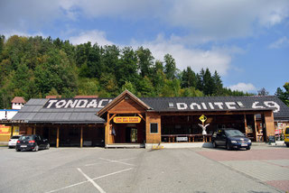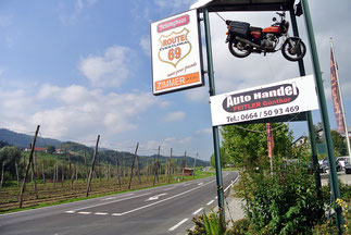 Anschließend ging's hügelig weiter auf der Südsteirischen Grenzstraße B69 in Richung Weinstraße, wo wir auch beim "Route 69" vorbeikamen, einem beliebten Treffpunkt für Motorradfahrer jeglichen Coleurs, der auch Übernachtungsmöglichkeiten anbietet und mir von Tom schon einige Male ans Herz gelegt wurde. Da wir den Schilcher-Sturm vor uns jedoch schon fast riechen konnten, legten wir nur einen kurzen Foto-Stopp ein: