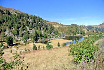 52 Kehren, die hier Reidn genannt werden und von der Innerkremser Seite kommend durchnummeriert sind, bietet die Nockalmstraße – nach der Eisentalhöhe sind's noch ca. 15, die ich durchs Umkehren "herschenke", dafür fahre ich die anderen am Weg zurück ein zweites Mal. Wobei wir diesmal am Retourweg ziemlich genau zwischen Eisentalhöhe und Glockenhütte rechts dem Schild zu einem Almgasthaus folgten, das Speck und Käse anbietet. Schon nach wenigen Metern wird die Straße zu einem gepflegten Schotterweg, nach etwa eineinhalb Kilometern gelangt man zur besagten Gaststätte. Der Chef verkaufte uns zum Ende der Saison zwar weder Käse noch Speck zum Mitnehmen, weil er alles für seine Gäste benötige – beim nächsten Mal werde ich aber sicher dort, abseits des Touristenrummels auf der Eisentalhöhe, einkehren. Fährt man die Schotterstraße weiter, gelangt man übrigens nach ca. 14 Kilometern über den Leobengraben im kleinen Ort Leoben auf die Katschberg-Bundesstraße und in weiterer Folge nach Gmünd. Umgekehrt gefahren stellt dieser Weg auch eine Möglichkeit dar, die Nockalm-Maut zu "sparen". Zwar steht direkt neben dem Almgasthaus ein Schild mit der Aufschrift "Maut", es war aber weit und breit niemand zu sehen, der diese auch abkassiert hätte...